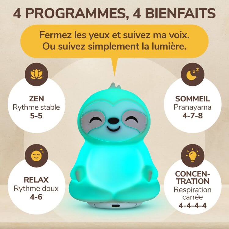 - 4 programmes guidés : Zen, Relax, Sommeil, Focus.