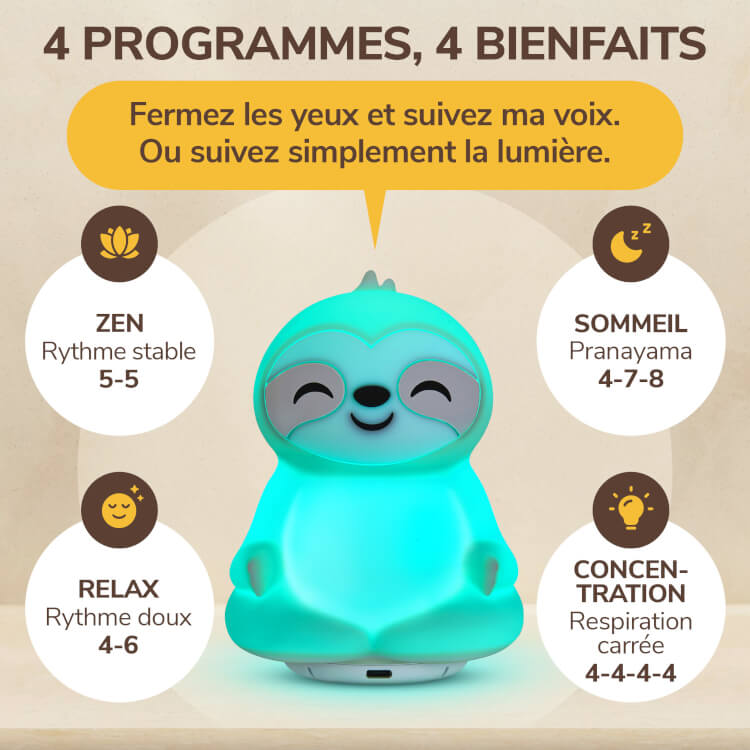 - 4 programmes guidés : Zen, Relax, Sommeil, Focus.