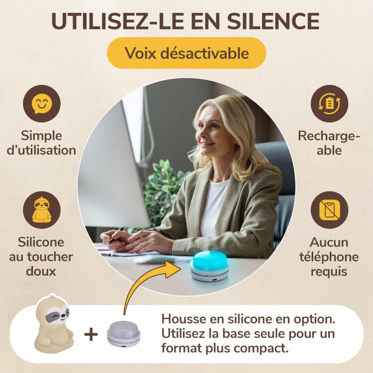 - Volume réglable et option de coupure totale de la voix pour une utilisation discrète au bureau ou la nuit.